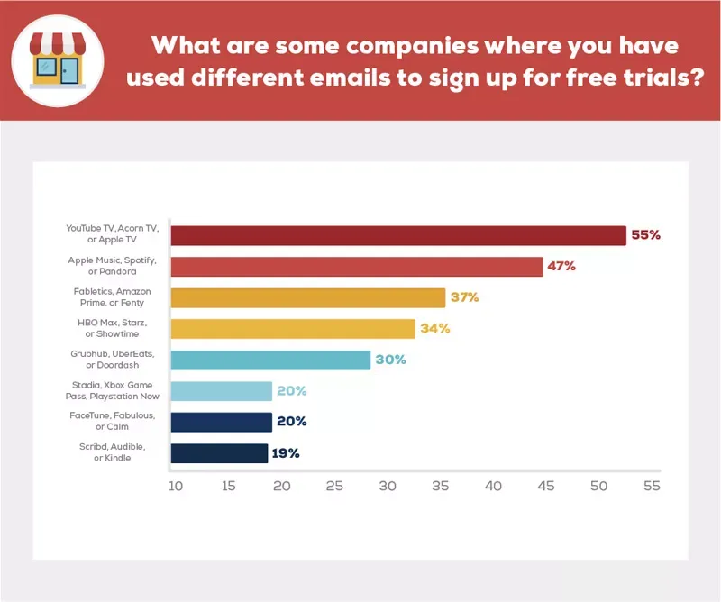 - 55% of respondents said they’ve used different emails to sign up for free trials with YouTube TV, Acorn TV, or Apple TV. These were closely followed by 47% of respondents saying that they used different emails to sign up for free trials to Apple Music, Spotify, and Pandora.