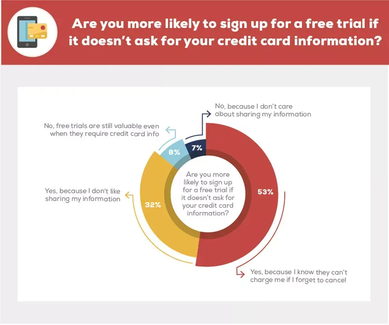 - 53% of respondents said they are more likely to sign up for a free trial if it doesn't ask for a credit card, because they know they can't be charged if they forget to cancel the service.