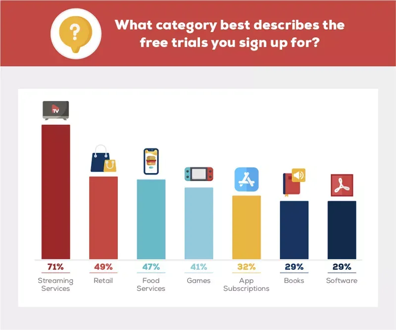 - 71% of respondents signed up for a free trial for streaming services, making this category the most popular, followed by retail at 49%, food services at 47%, and software trials at 29%.